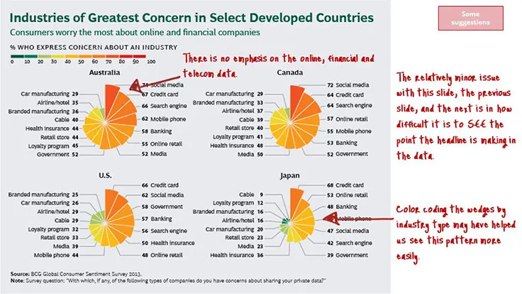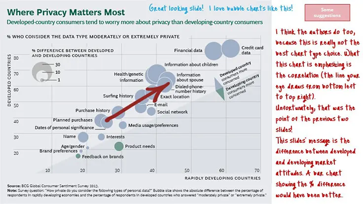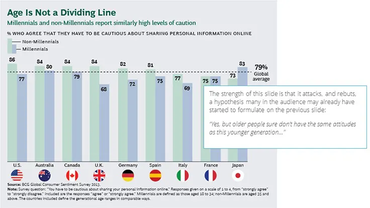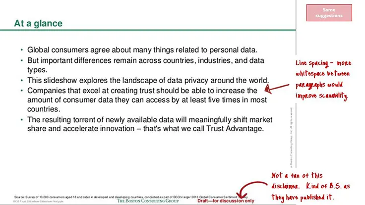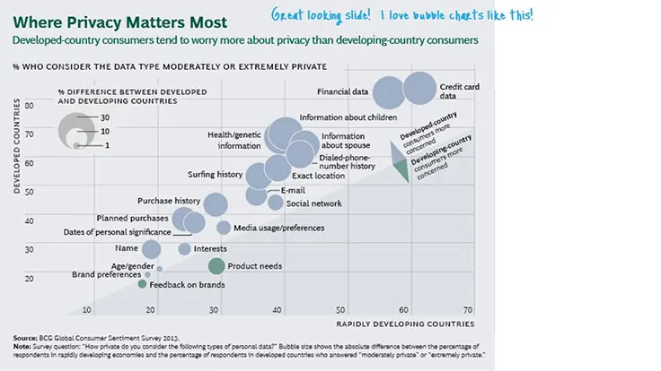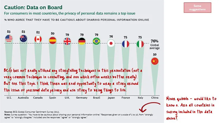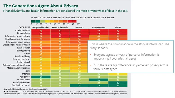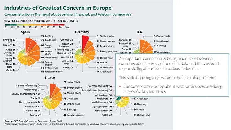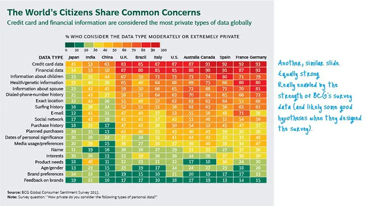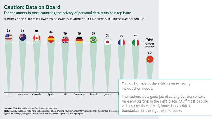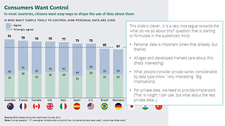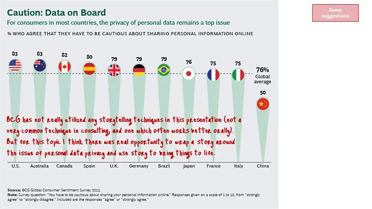 BCG has not really utilized any storytelling techniques in this presentation. To be fair, storytelling is not a very common technique within consulting and is one that often works better orally. Having said that, I think this topic presents a real opportunity to wrap a story around the issue of personal data privacy. It is an emotionally charged subject. Storytelling techniques could really bring this personal dimension into focus.