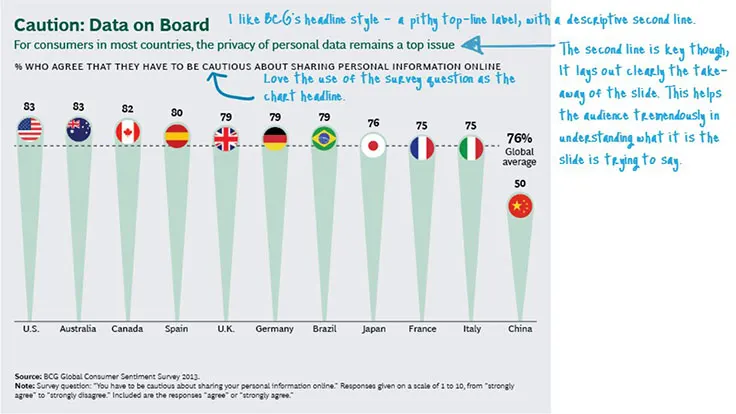 I like the headline style BCG has adopted – a pithy top-line label with a descriptive second line. The second line is absolutely key. You want to ensure that your headline clearly lays out the take-away of your slide. This helps the audience tremendously in understanding what it is the slide is trying to say.