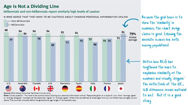 The interesting thing to note in this business chart is the chart design. BCG’s goal is to emphasize the similarity of the numbers and visually disguise the delta (to reinforce their conclusion, captured in the headline, that age doesn’t really tell us much). Notice how the length of the bars have been lengthened as much as possible? The delta in the UK of 16% sure seems material to me. But it is a good story.