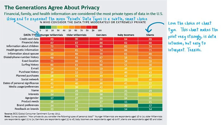 I like the choice of a heat map to display this data. Using red to represent the more ‘Private’ data types is a subtle, smart choice.