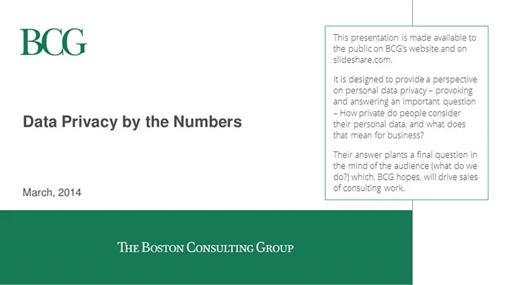 BCG’s presentation ‘Data Privacy by the Numbers’ is designed to provide a perspective on personal data privacy – provoking and answering an important question: How private do people consider their personal data, and what does that mean for business?