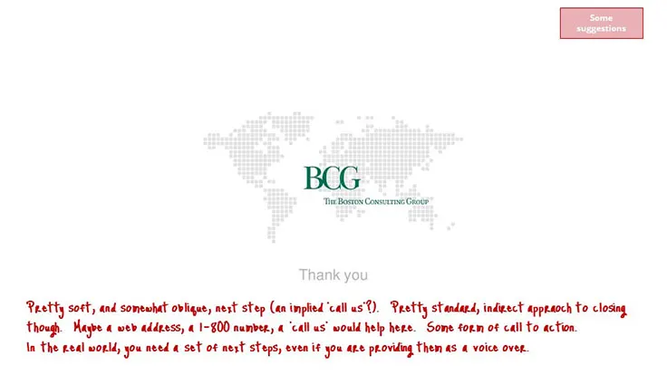 This presentation is BCG’s answer to that question. The presentation concludes by planting a final question in the mind of the audience (what do we do?) which, BCG hopes, will drive sales of consulting work.
