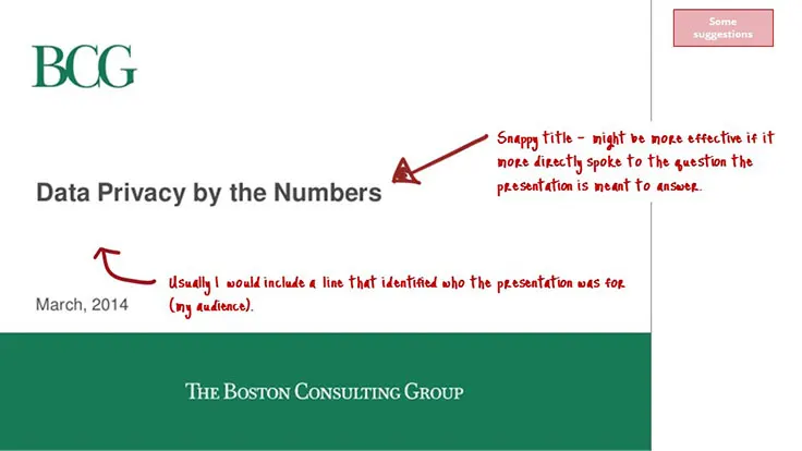 Consulting presentations like this one tend to be heavily footnoted. This is a good thing. Footnotes provide credibility. More importantly, when you cite numbers and statistics (as BCG will do extensively in this presentation) you need to say where you got the data from. Not providing footnotes is, at best, lazy, and at worst, dishonest.