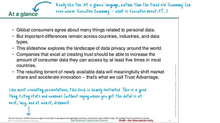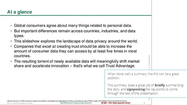 When done well, summaries like this one can be a great addition. BCG’s summary does a great job of being brief and signposting the key points to come in the presentation. You want to avoid re-writing the entire presentation in the summary.